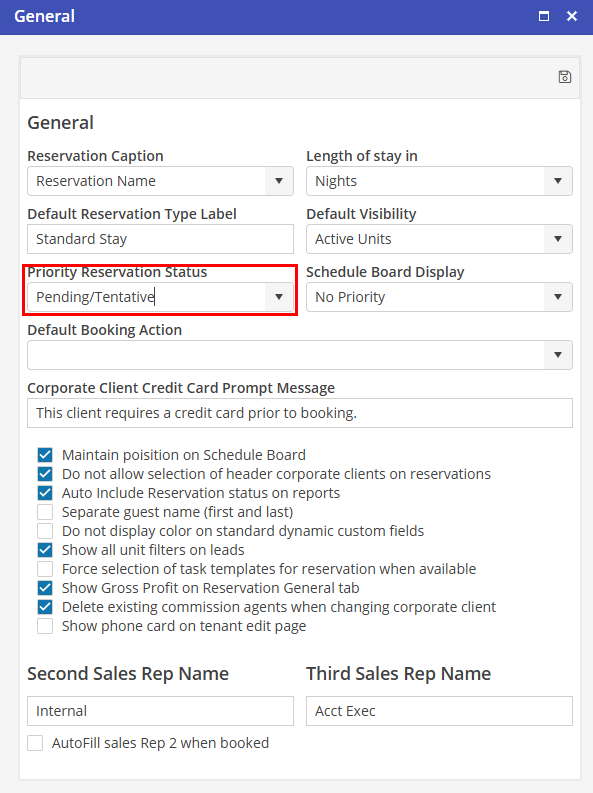 Priority Reservations may only be booked if the Status of the record matches the Priority Reservation Status selected here. Typically, Reservations are