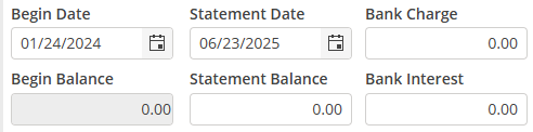 The Begin Date will auto populate with the date after the last Statement Date. The initial reconciliation will allow editing of this field. Consecutive reconciliations will not allow editing of this field.