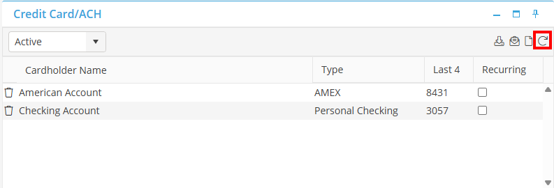 Refresh From the Credit Card/ACH Card, clicking the 'Refresh' icon will refresh the information that displays on this card.