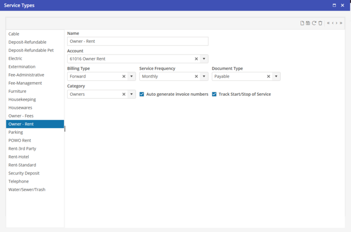 Billing Type - The AP Batch posting screen has recently been updated to allow the retrieval of prior financial period detail lines. This would allow the Service Type setting to be Billing Type “forward”. We recommend using the “forward” Billing Type as it allows the user more control retrieving and posting. If set to Arrears, amounts due to owners will be retrieved into the AP Batch posting screen for the prior financial period and posted in the current period; this could create skewed P&L by unit reporting.