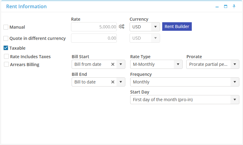 Rent Builder Options Once the reservation is booked, the Rent Builder option may be used for the tenant ledger by deselecting the Manual option on the Rent Information Card.