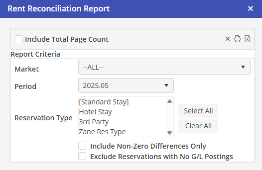The report may be filtered by the following options: Market, a single Financial Period and any combination of Reservation Types.