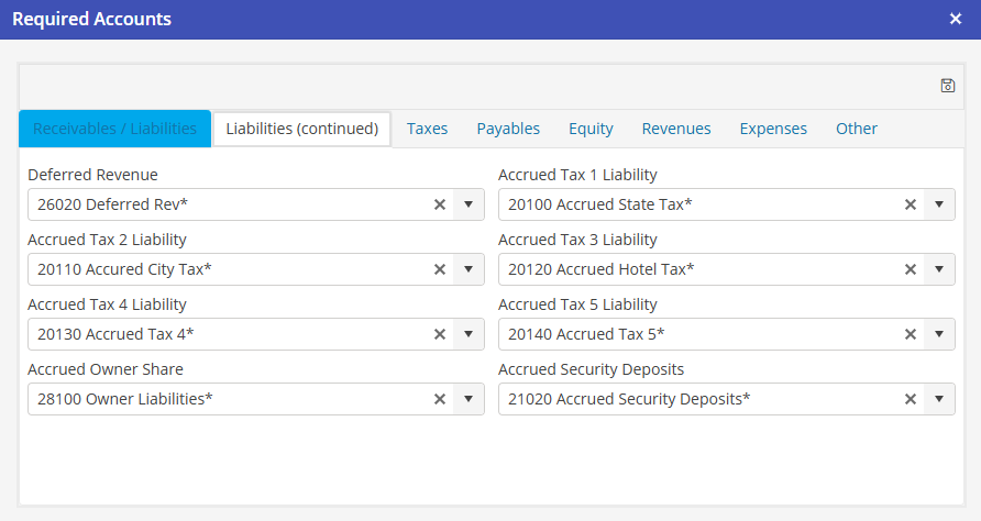 Required Accounts Select the Owner Liabilities account on the Liabilities (continued) tab under Accrued Owner Share.