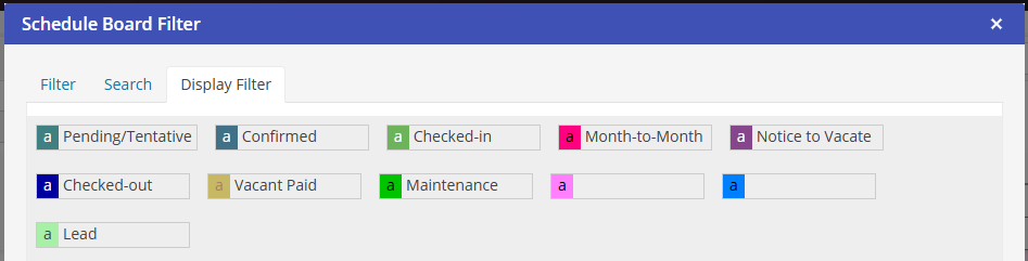 For a Reservation, each color demonstrates a different reservation status (as defined in settings).