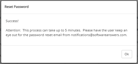 After verifying that you would like to Reset a Password for this user, the system will display the following message.