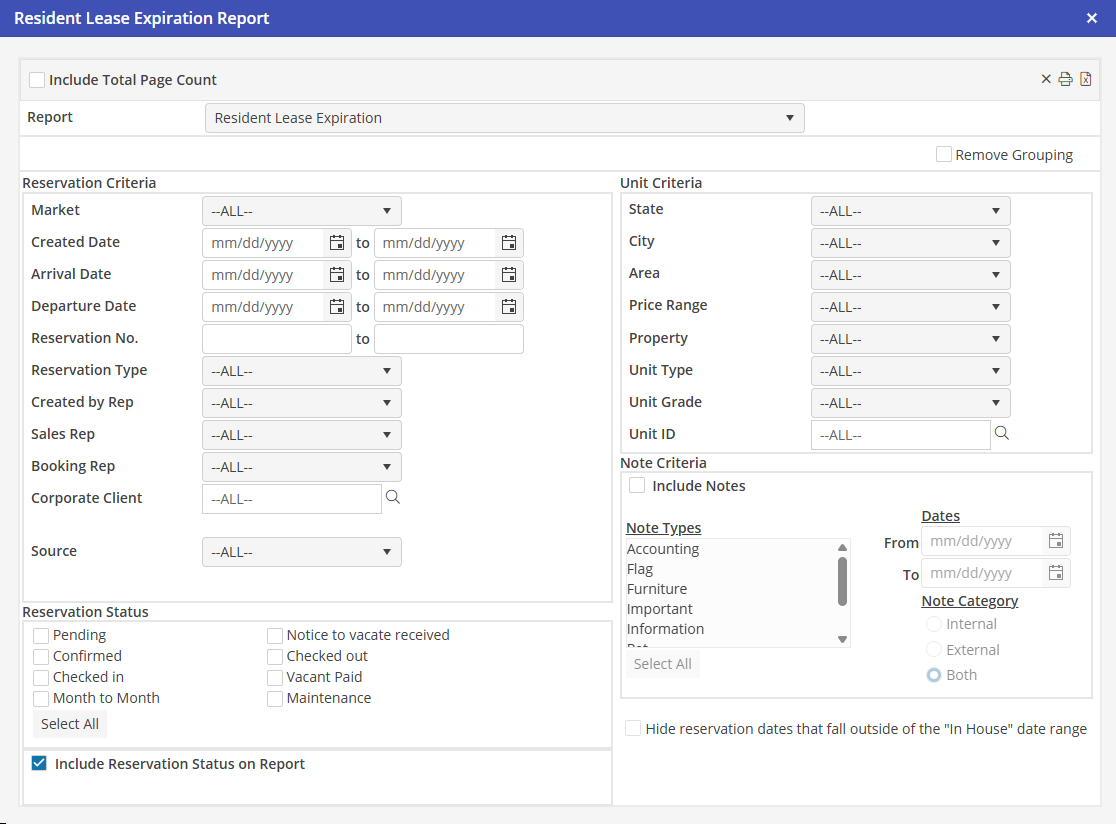 Using all, none, or a combination of the system filters in the Reservation and Unit Criteria sections, the User can create a comprehensive report.