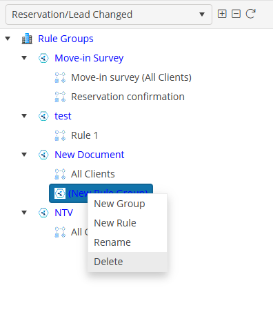 To delete a Rule Group, right click on the Rule Group and select “Delete”. Note: the default Rule Group “Reservation Created/Modified” may not be deleted.