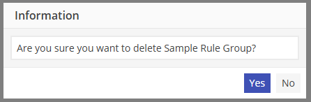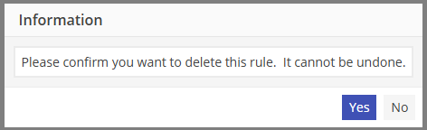 A final prompt will appear “Please confirm you want to delete this rule. It cannot be undone.” Clicking yes will delete the Rule Group. Click No to cancel the deletion process.
