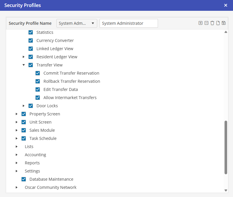 To Commit, Rollback or Edit Transfer Data, the User must be granted access to Settings > Security Profiles > Reservation Screen > Transfer View > Commit Transfer Reservation, Rollback Transfer Reservation and Edit Transfer Data. To schedule a transfer for a Reservation in a in a different market than the originating market, the User must also be granted access to Allow Intermarket Transfers.