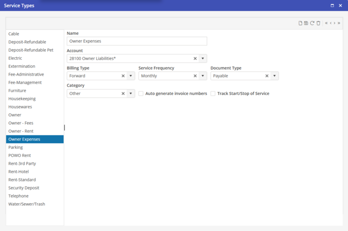 Service type - Two Service Types must be added to the application; Owner and Owner Expenses.
