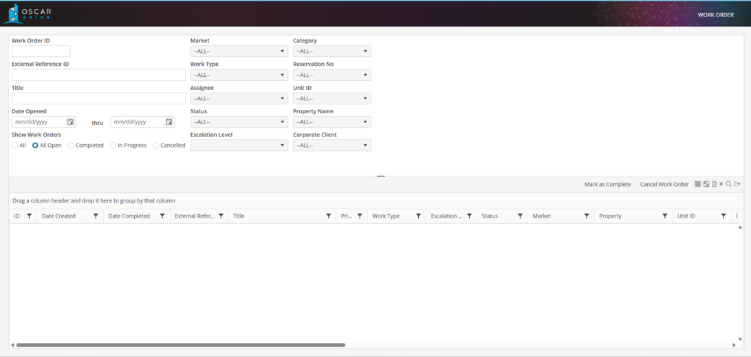 Filter by any of the Work Order Management Filter options available. When the Work Order Management screen is opened from a Reservation, Unit or Property, the associated record filter will automatically be in place. The Work Order Management screen may be maximized so that more information may be visible without scrolling.