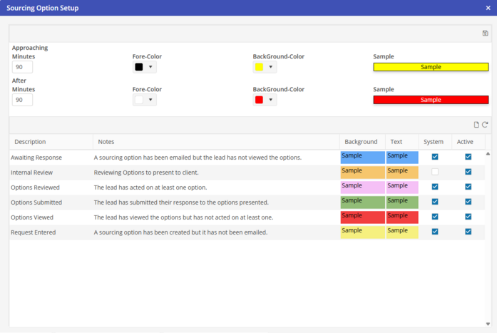 Sourcing Options Setup Use these settings to set the color for Sourcing Options that are Approaching their Deadline, or have exceeded their Deadline. Go to Settings > Program Settings > General > Sourcing Option