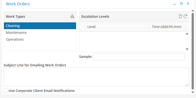 When creating a Work Order, if the “Email notification to resident” indicator on the Work Order is populated, the Resident will receive an email upon creation of a new Work Order, canceling a Work Order and completing a Work Order. The Subject Line will contain the text that is typed in this box. This field is located on the Work Orders card of the Corporate Client record.