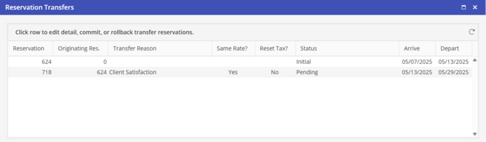 To access any associated Reservations, click on the Reservation Transfer button within the Information Card of the original OR transferred Reservation. The Transfer Information Grid is available for viewing as long as there are Transfers associated with this Reservation. Once associated Reservations are cancelled, they will no longer be associated.