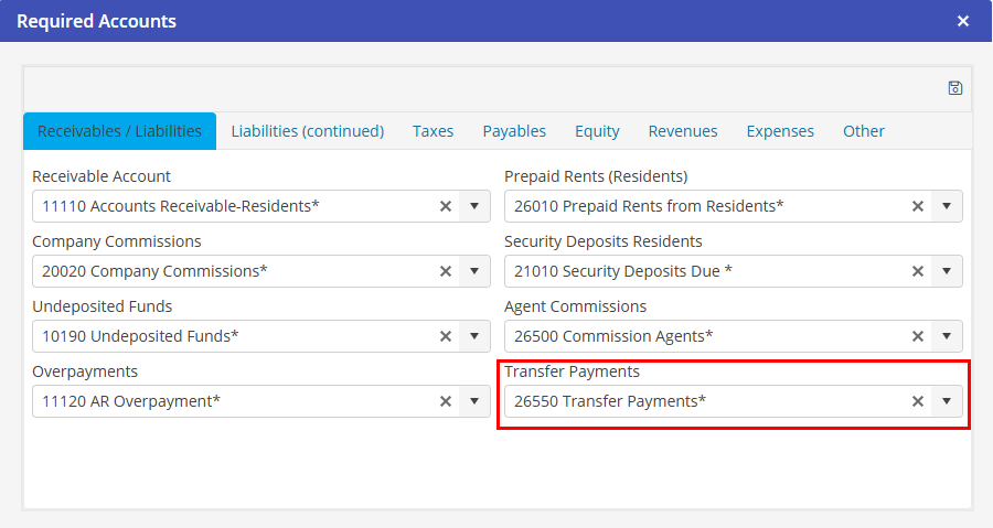 Create a General Ledger account for the transfer of payments. Select this account in the “Transfer Payments” section of the Required Accounts.