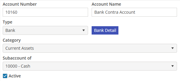 The sum of all bank accounts will be entered into a Bank Contra Account which will be used as a clearing account. Only one Contra Account is required. Create a single Bank Contra Account, with the Type selected as Standard.
