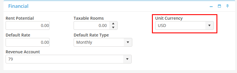 Select the Unit Currency in the Financial Card of the Unit Record.