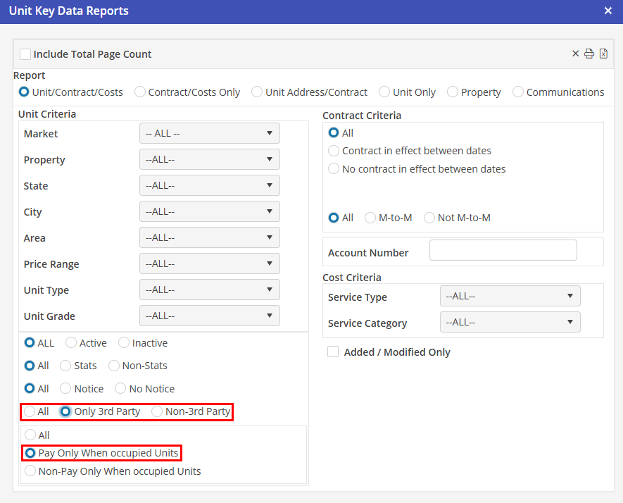 Two new filter options have been added to the report: 3rd Party and Pay Only When Occupied Units.