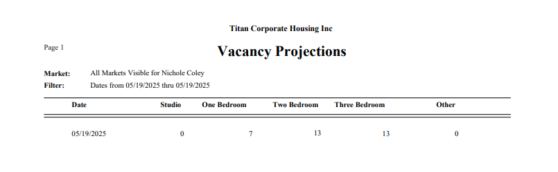 This report is located under Management > Unit > Unit Vacancy Projection. The Vacancy Projection Report provides a listing of the total number of Units for each Unit type (studio, one bedroom, two bedroom, 3 bedroom, and other) * that are available to rent on each day of a selected date range. In this report, a Unit that is available to rent on a particular day is designated as “vacant.”