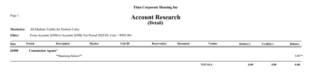 Verifying Commission Liabilities Use the Account Research report to verify the Commission Liability amounts. Select Commission Liabilities account. The balance in this account by Unit ID is the Commission balance due.